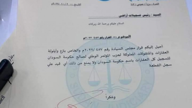 قرار بنزع ممتلكات حزب المؤتمر الوطني المحلولأصدر مجلس السيادة السوداني قرارًا بنزع العقارات المملوكة لحزب المؤتمر الوطني المحلول لصالح الحكومة. ووقّع على القرار الأمين العام لمجلس… أكمل القراءة »